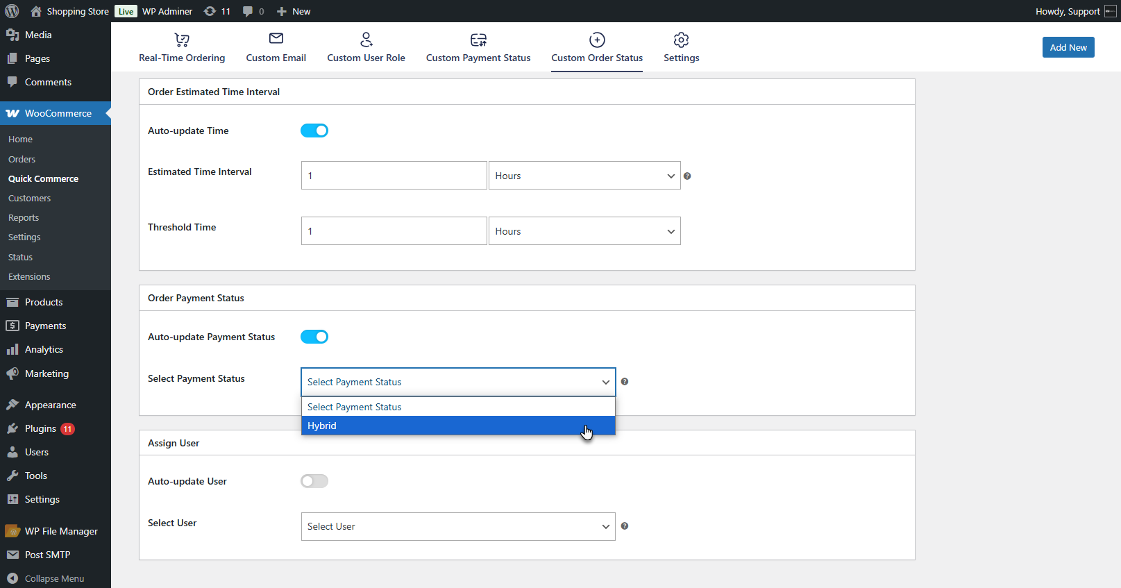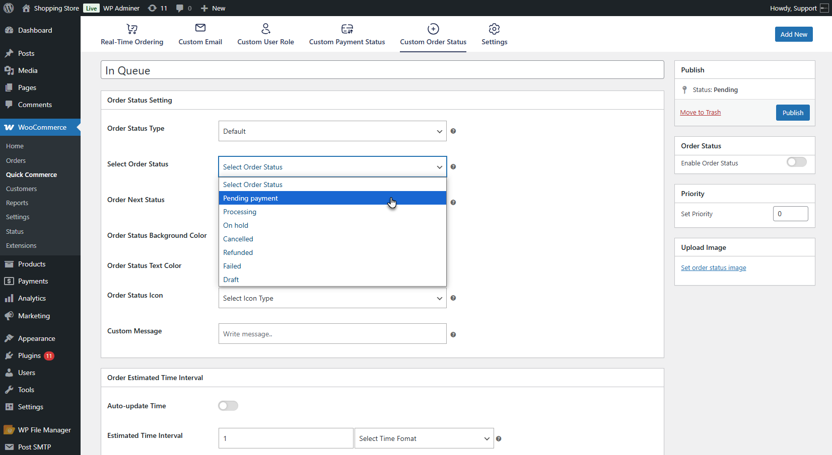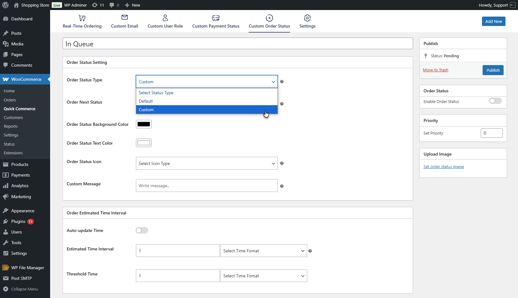 - If Custom is selected, the admin can create and add a new custom order status independently.