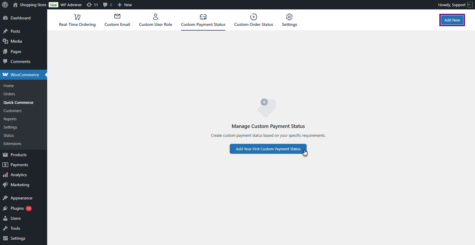 - For the first payment status, click the Add Your First Custom Payment Status button or the Add New button from the top navigation bar.