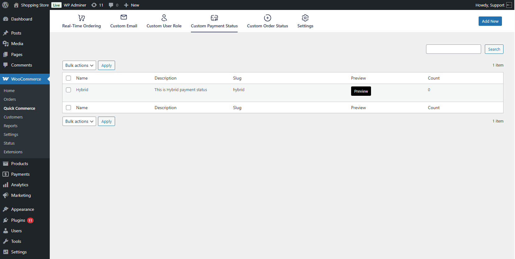 - The payment status will be created and listed on the Custom Payment Status List page. Each status in the list will display its name, description, slug, and Preview.