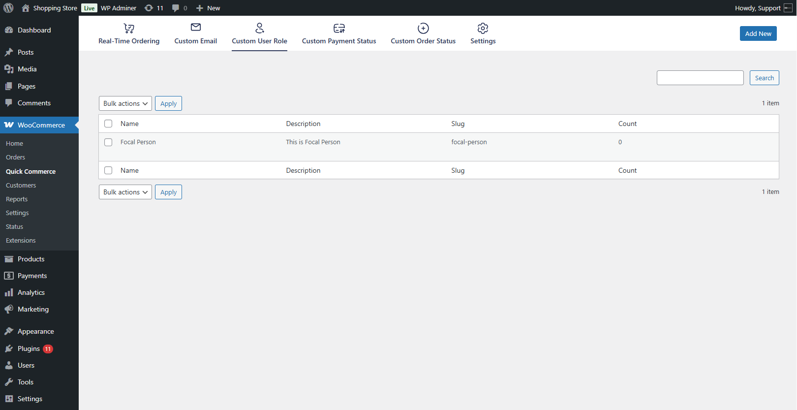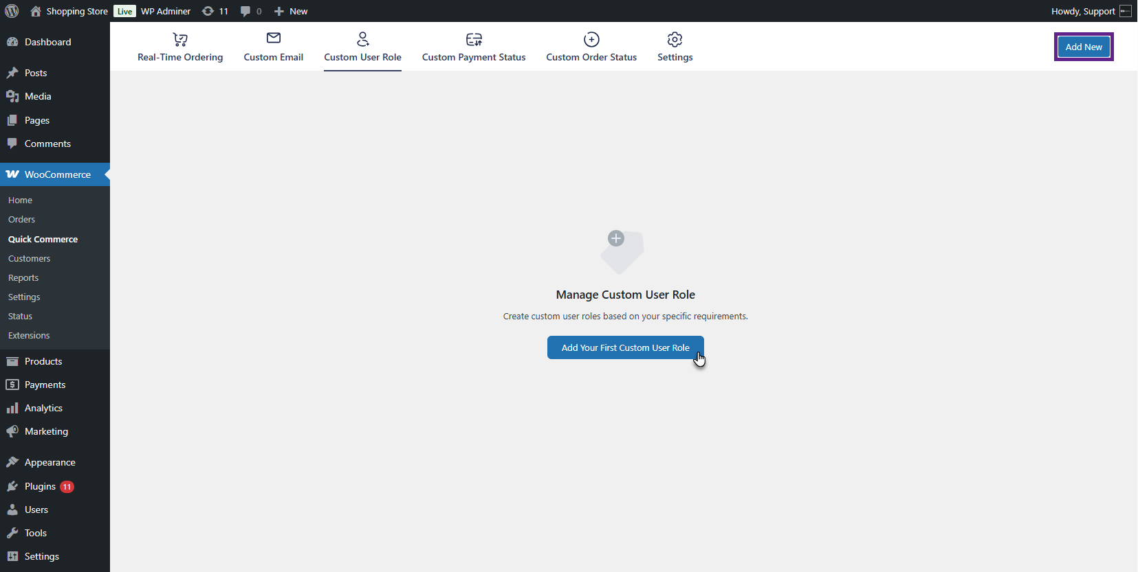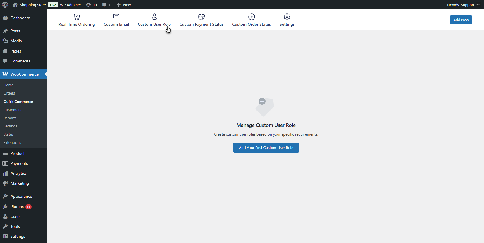 - To add custom user roles, navigate to the WordPress Admin Dashboard > WooCommerce > Quick Commerce > Custom User Role.