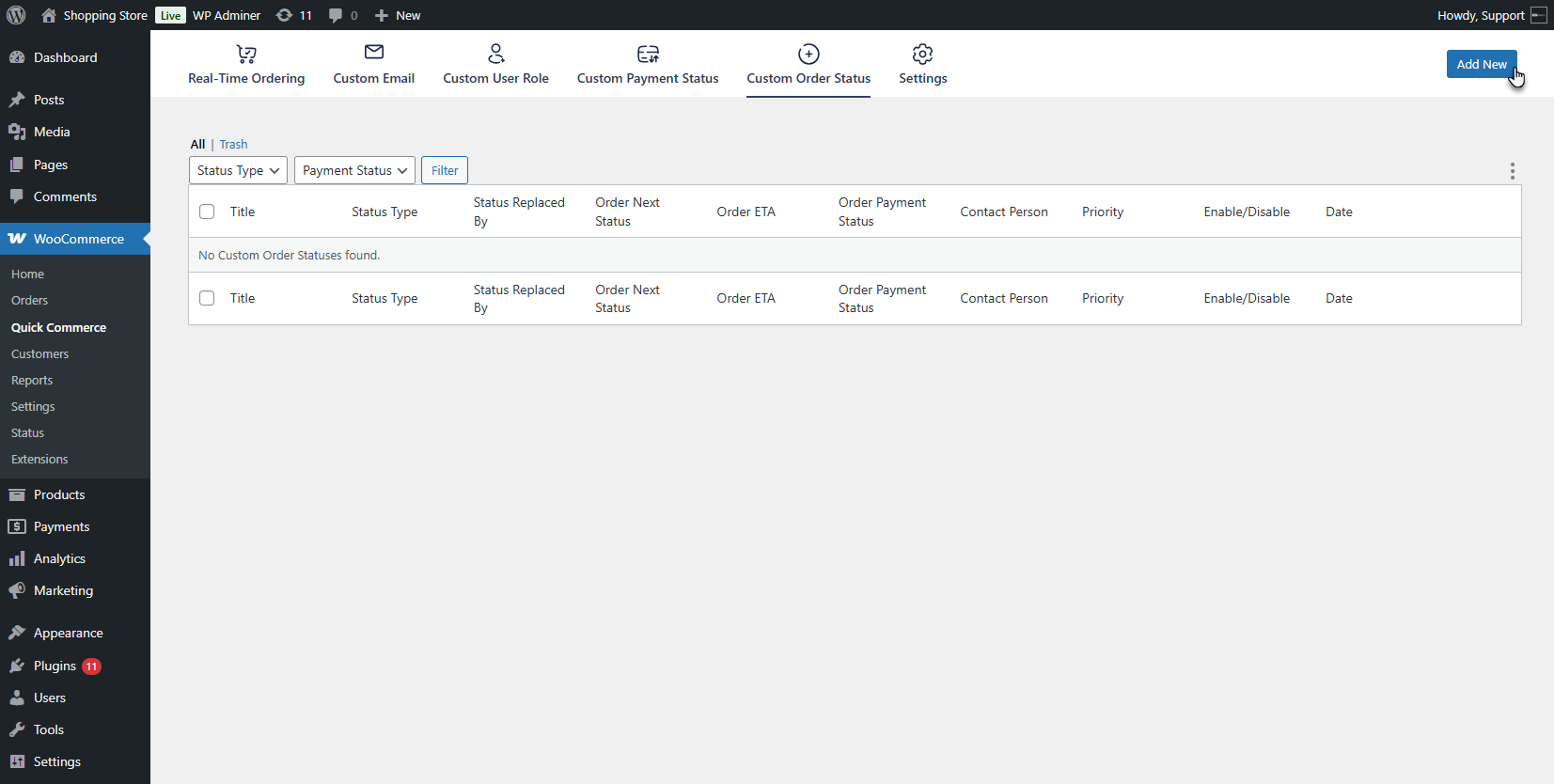 - The Custom Order Status list page will appear. Click the Add New button from the top navigation bar to add your first custom order status.