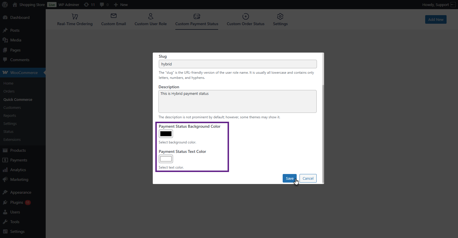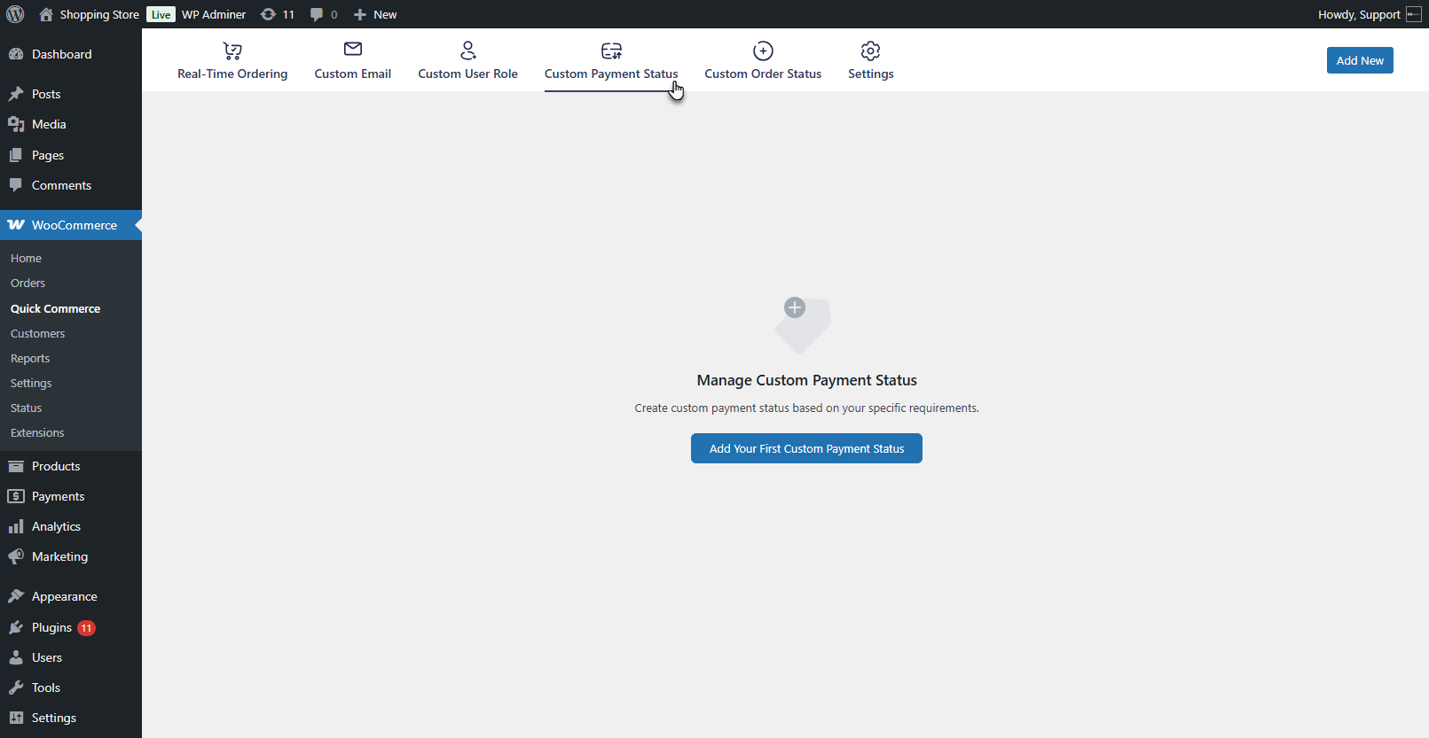 - To add a custom payment status, navigate to the WordPress Admin Dashboard > WooCommerce > Quick Commerce > Custom Payment Status.