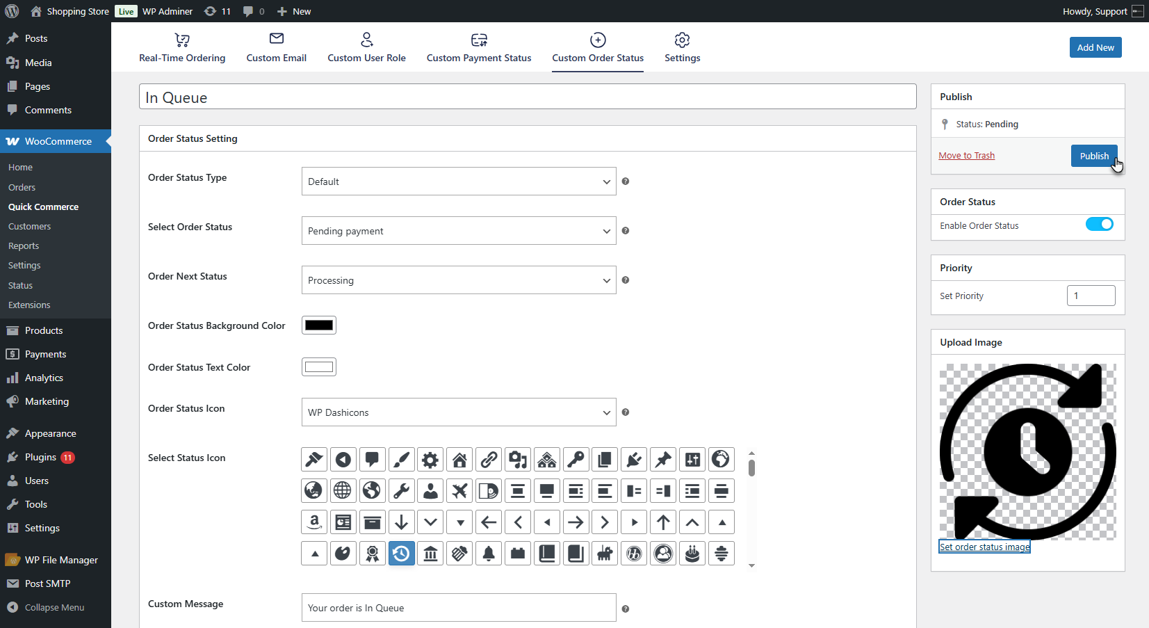 - Once all the fields are filled, click the Publish button to create and activate the custom order status.
