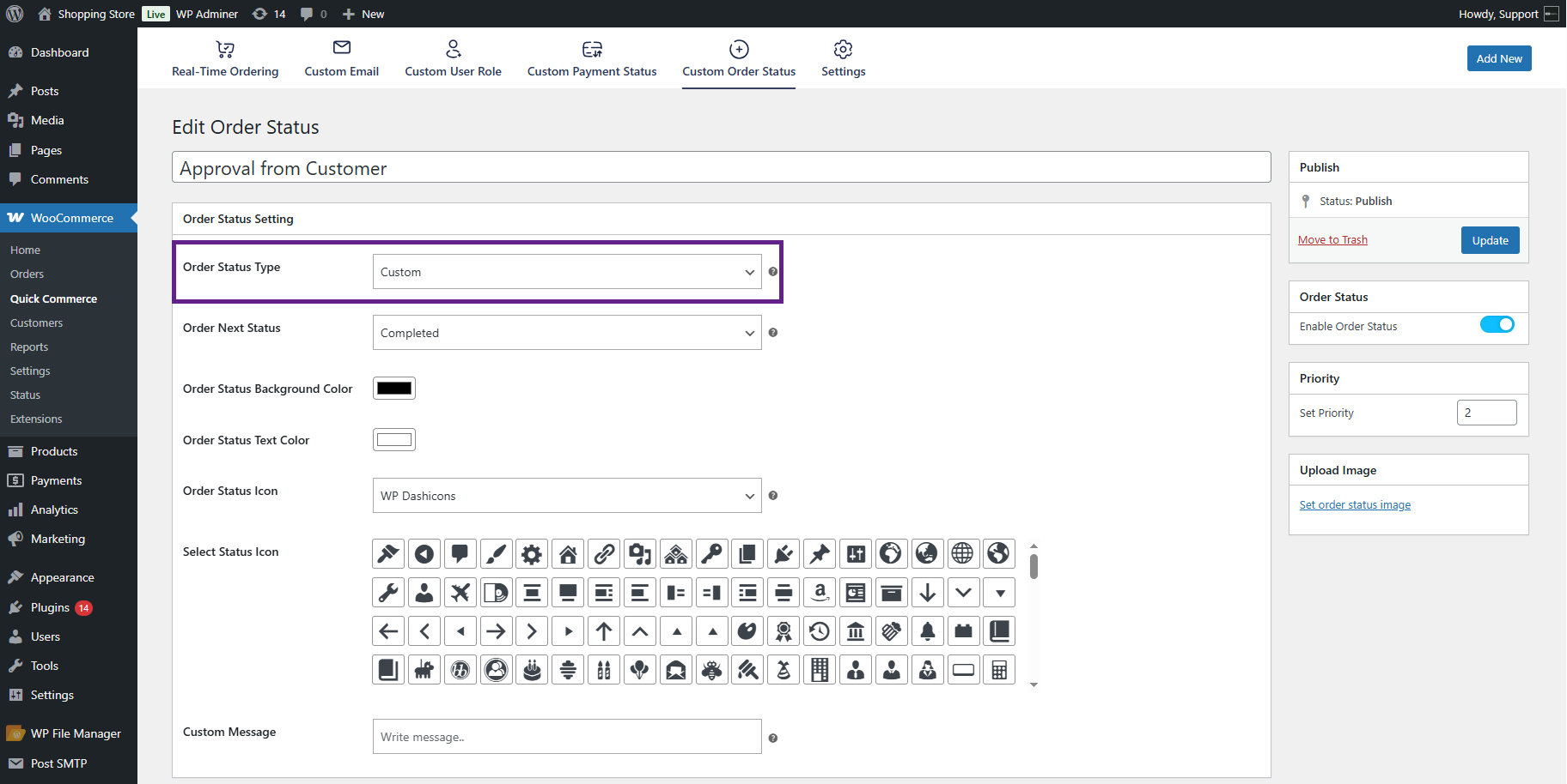 - Select an Order Status Icon from the dropdown list. Two options are available: WP DashIcons or Custom. The admin can choose from the provided WP DashIcons or upload a custom icon.