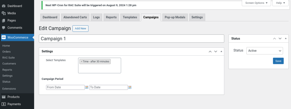 Note: If “Campaigns” menu is not displaying, go to “WooCommerce > RAC Suite > Settings > Campaign” and select the “Enable Campaign” option and setup the campaign.
