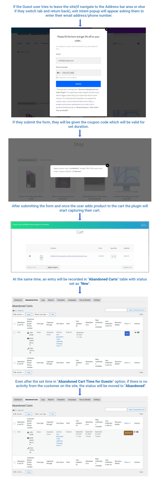 Capture Guest Cart: To capture carts of guest users on the site, enable this option. If enabled, whenever a guest user gives their phone number/email address on the checkout page, a new cart entry will be recorded in the Abandoned Carts table with “New” status.