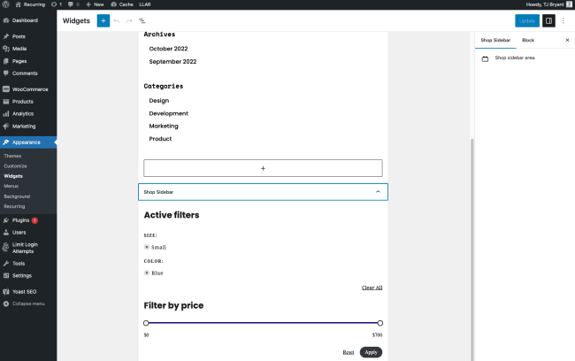 ↑ Back to topThe Recurring theme comes with two widget areas: one for the Shop Filters Sidebar and another one for the Footer. Both can be managed via Appearance > Widgets.