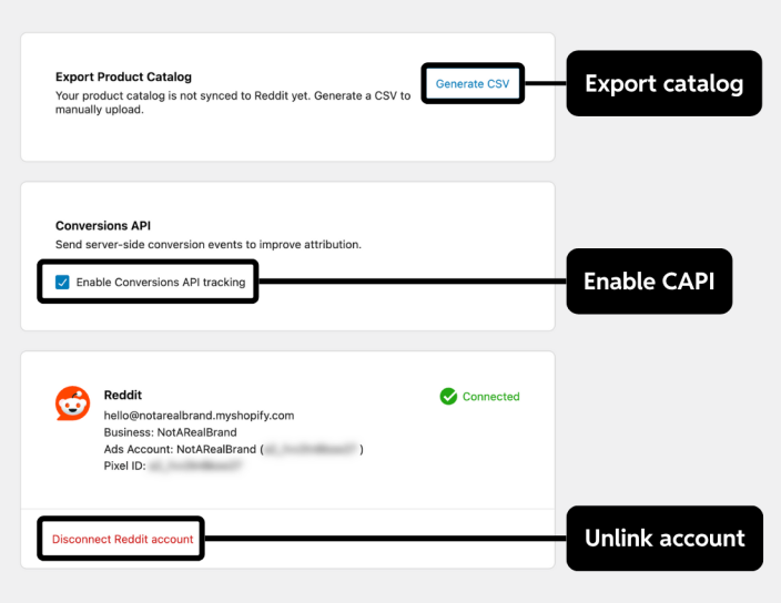 - Share conversion events: Forward conversion data to Reddit to measure campaign performance. By default, the plugin shares events through the Reddit Pixel. We strongly recommend enabling the Conversions API (CAPI) alongside the Pixel to improve accuracy, optimization, and targeting.