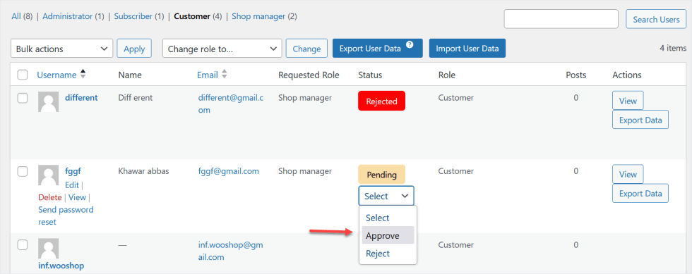 If user role registrations are enabled on your site, you can also view the user’s role status and approve or reject roles directly from the table.