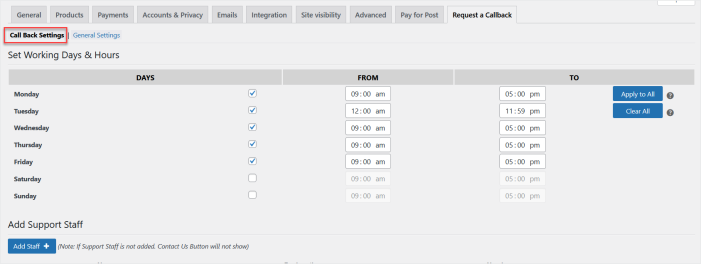 ↑ Back to topClick the “Callback Settings” tab, set your weekdays with working hours to enable the “Call Now” button during working hours.
