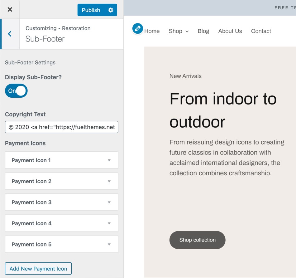 ↑ Back to topSub-Footer can be toggled and it’s content modified from Appearance > Customize > Restoration > Sub-Footer: