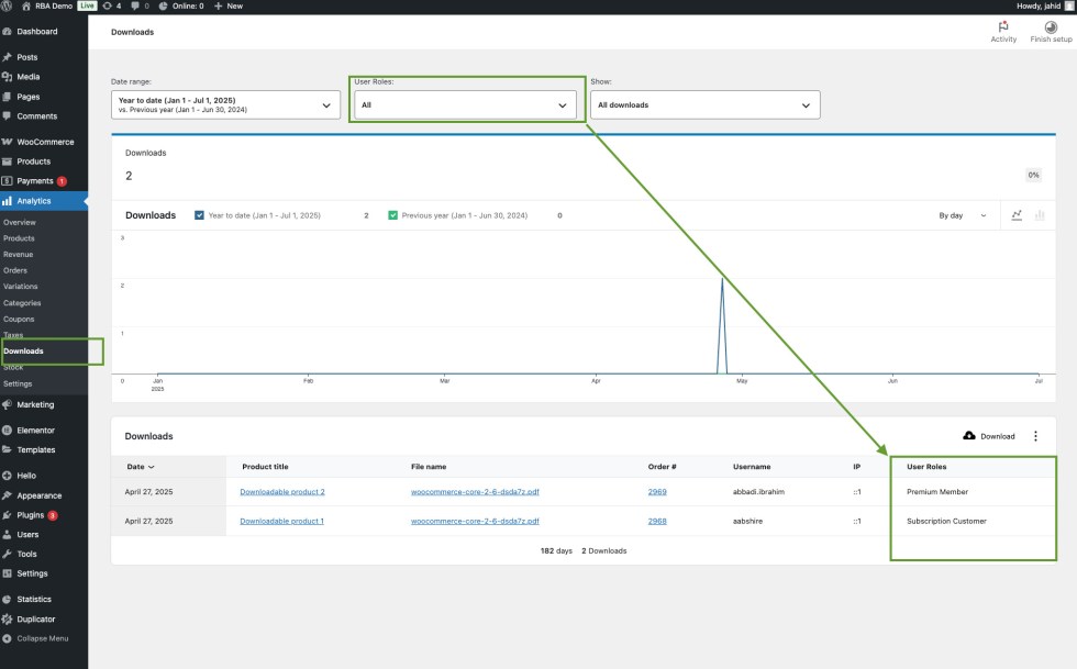 ↑ Back to topRole Based Analytics for WooCommerce extends the default WooCommerce analytics by adding a User Role column and a User Role filter to key reporting screens. This allows you to analyze sales data by user role—without altering the core behavior of WooCommerce analytics.