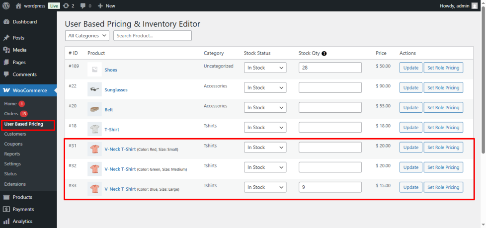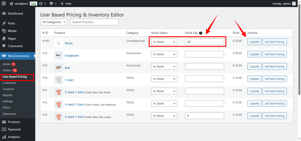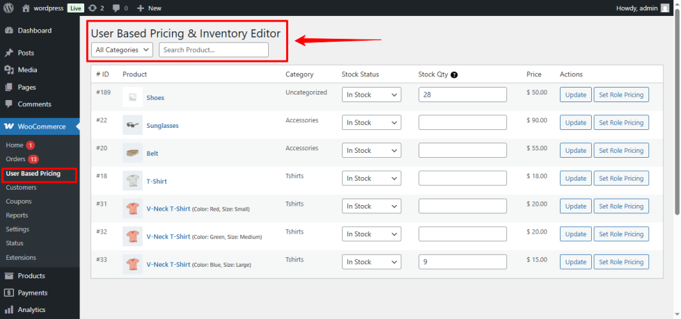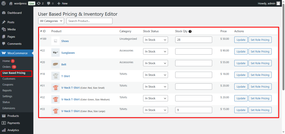 The plugin adds a new management tab inside WooCommerce → User Based Pricing, where you can quickly update inventory and configure user-role based pricing for all your products without opening products one by one.