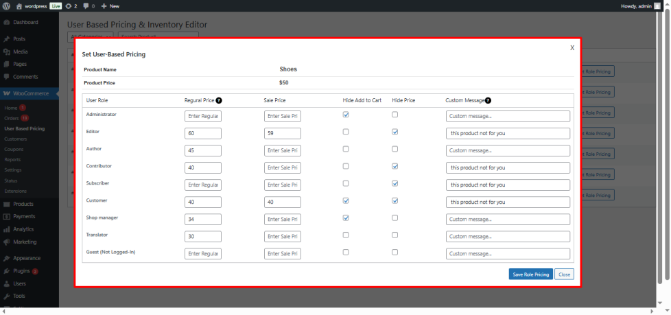 ↑ Back to top- Set unique regular and sale prices for each user role, including guests, giving you full control over pricing for wholesale, B2B, or membership-based stores.