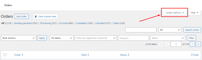 Find the Screen Options button in the top-right corner of the orders screen. Click it to reveal OrderFusion’s controls: