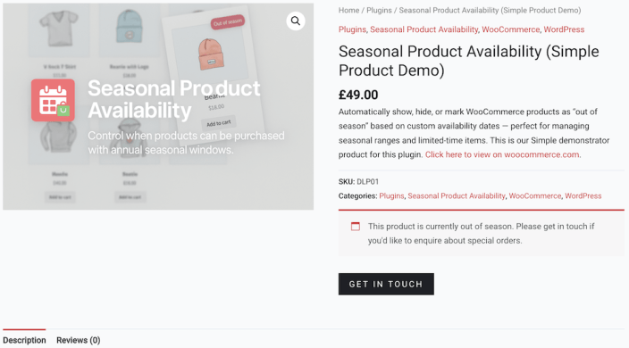 In this case, you can see that we have chosen to keep the price displayed for the product, even though it is out of season. You can also see the message we have chosen to display, alongside the get in touch link/button. These are all settings that could be configured individually using the settings described above.