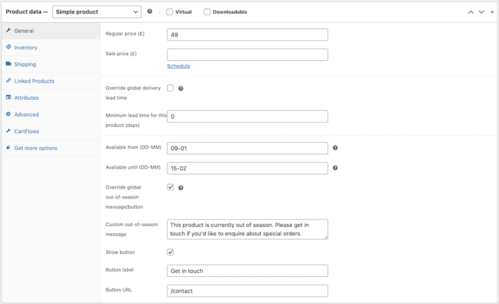 Once you’re in the General tab of the product editor, you’ll see several settings, which will allow you to configure seasonal availability for this particular product: