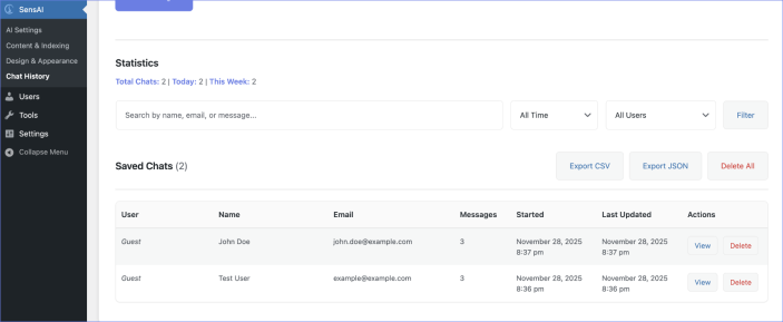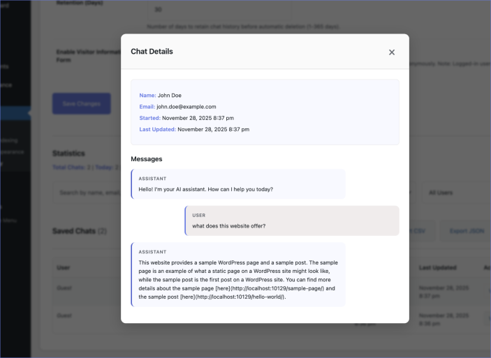 - Opens a modal showing visitor details and WordPress user info (if logged in)