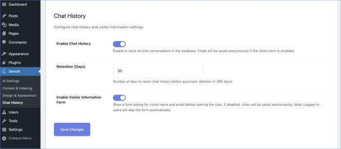 If disabled, chats still work, but nothing is stored. Enabling this option reveals two additional settings: Retention and Visitor Information Form.
