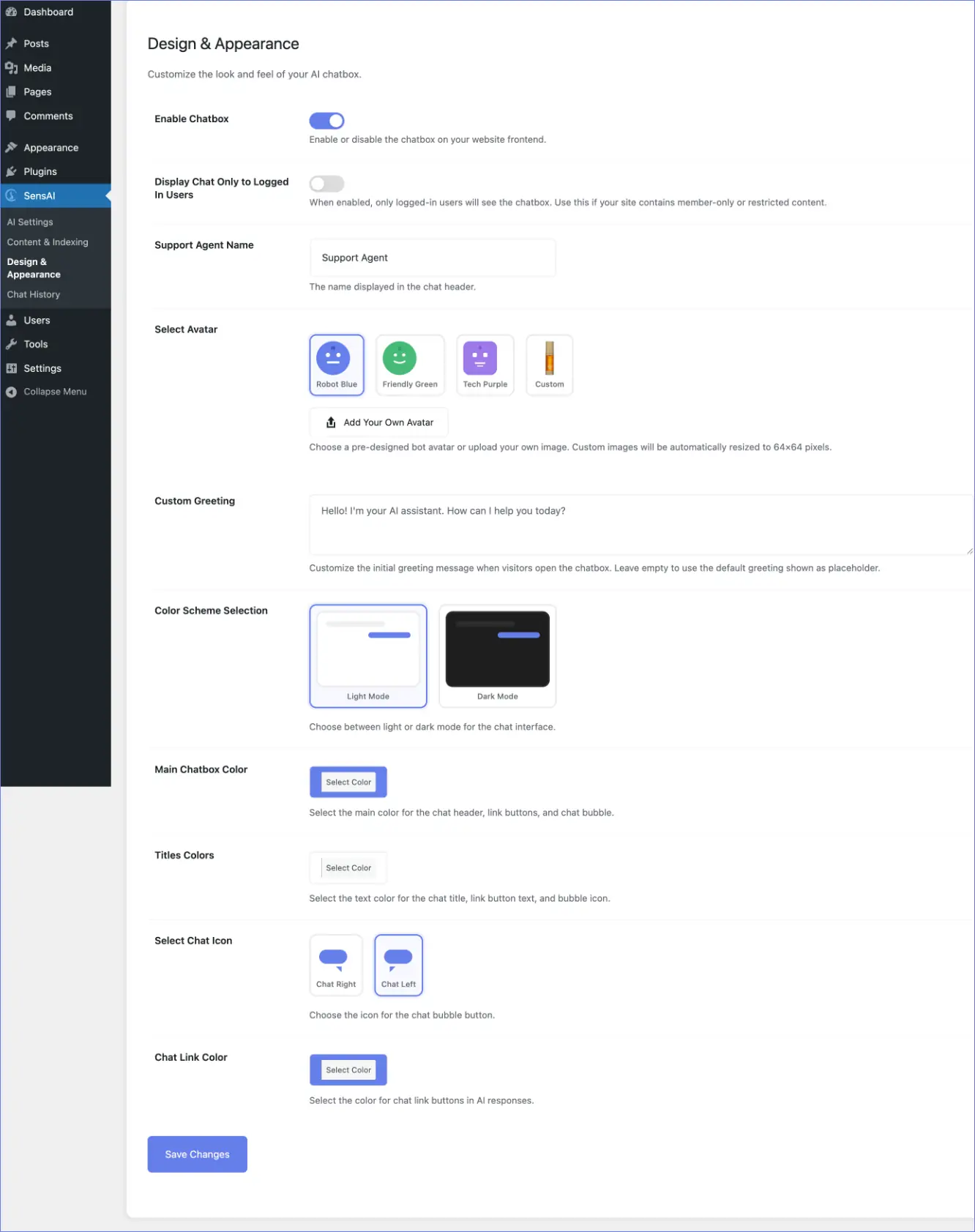 Choose between light or dark mode for the chat interface.