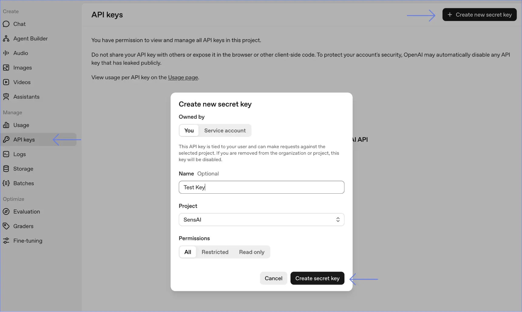 SensAI requires an OpenAI API key to function. Follow these steps to create and configure your key securely.