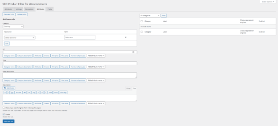 ↑ Back to topOn this tab, you can setup rules to add metadata to separate landing pages with active filter values or generate rules for product categories.