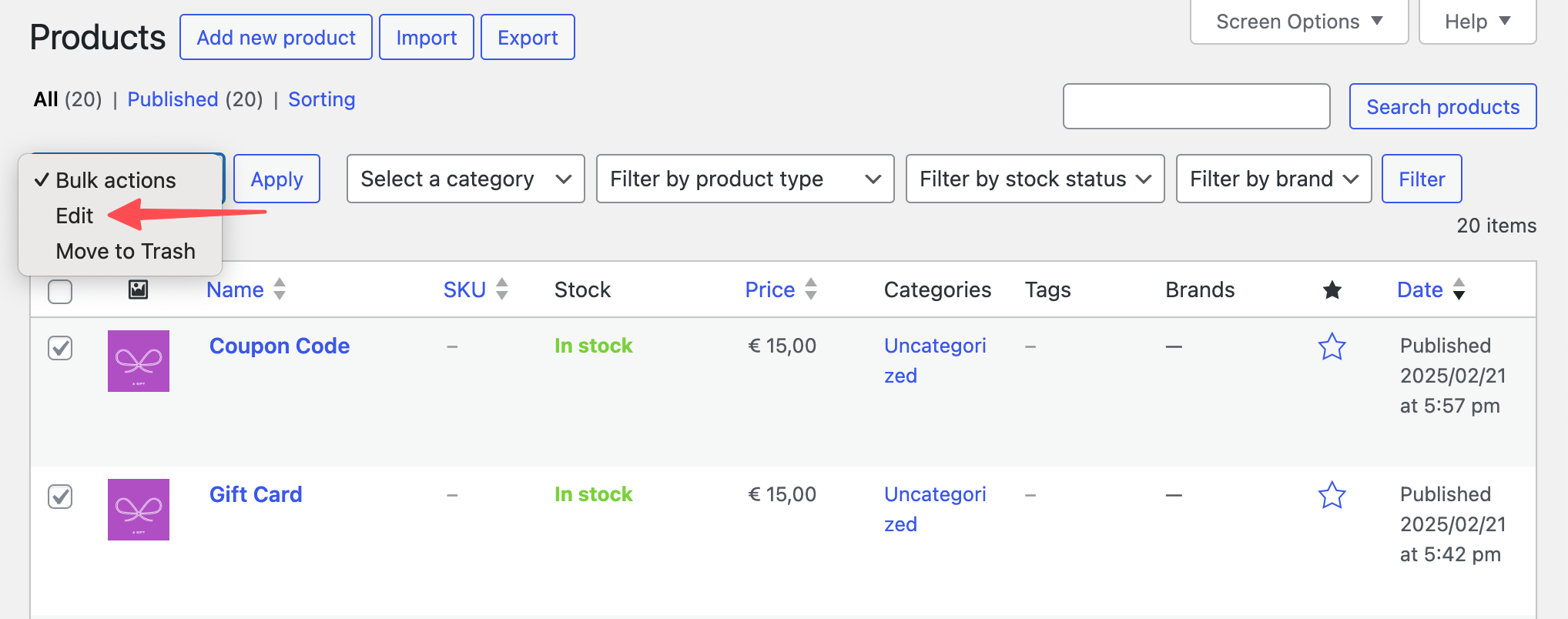 - Tick the box to the left of each of the products you want to bulk-edit.