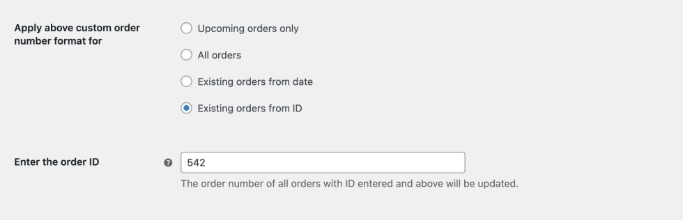 - Existing Orders from ID – Apply the custom order number format to all orders with the specified order ID and any orders placed after it.