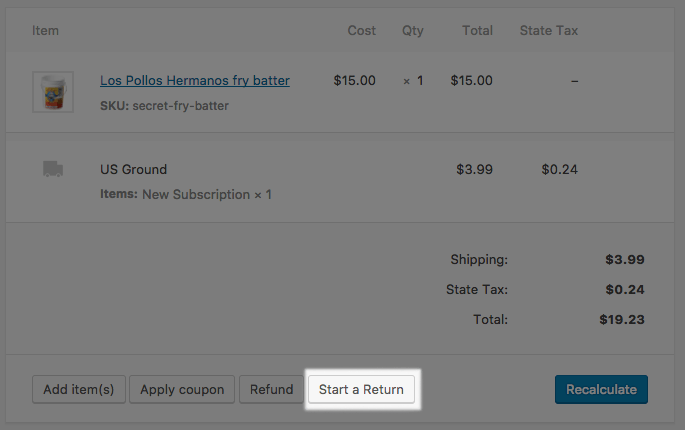 Heads up! Shipwire only supports one return per order, so you can only start a return once for any WooCommerce order. This action is disabled after a return has been processed.
