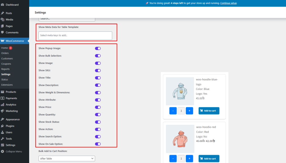 - Configure Show Meta Data for Table Template to include additional WooCommerce meta data