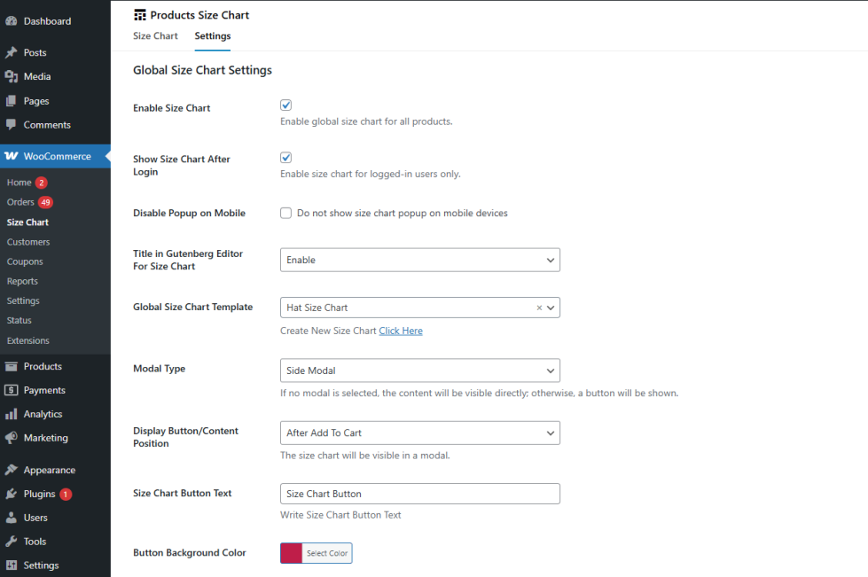 The global settings allow you to control how size charts behave across your WooCommerce store.