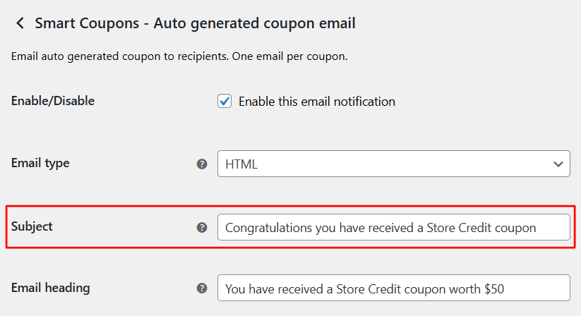 Smart Coupons automatically sends emails to customers when coupons are generated. You may want to personalize the subject line of these emails to better match with your brand requirements.