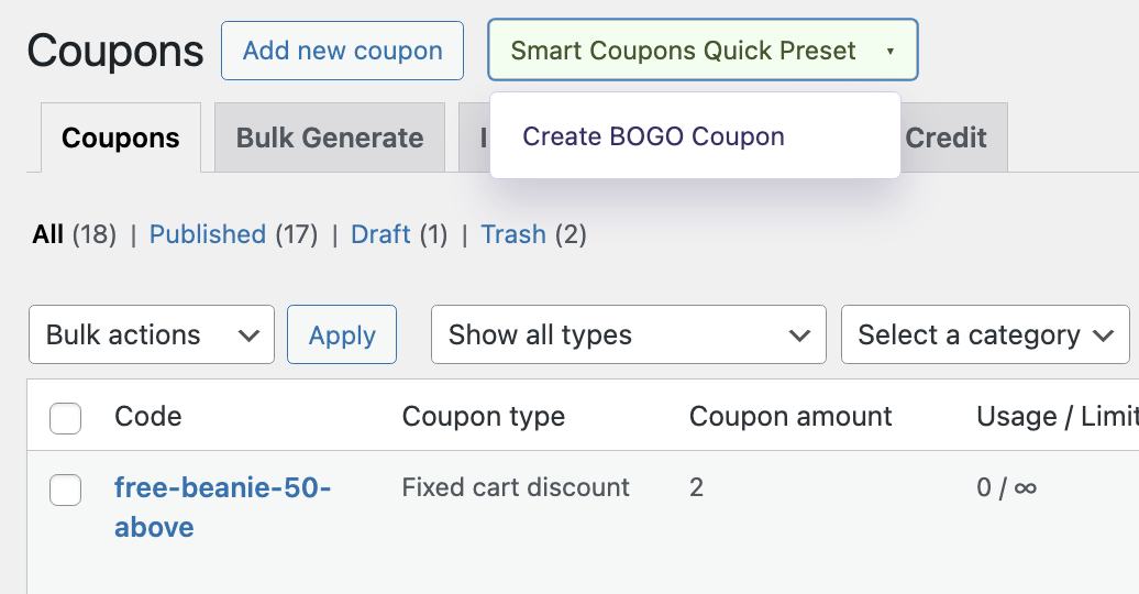 This document explains how to create a BOGO setup within a few minutes using the Smart Coupons presets.