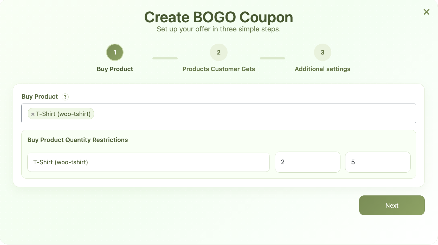 a. In the Buy Product field, add a product that you want the BOGO coupon to be applied to or, when this product is available in the cart, the coupon to be applied.