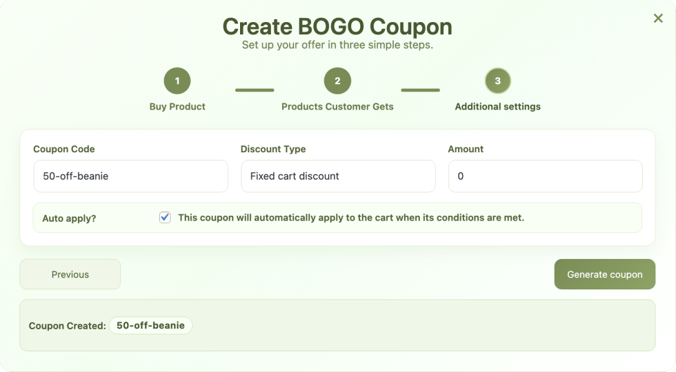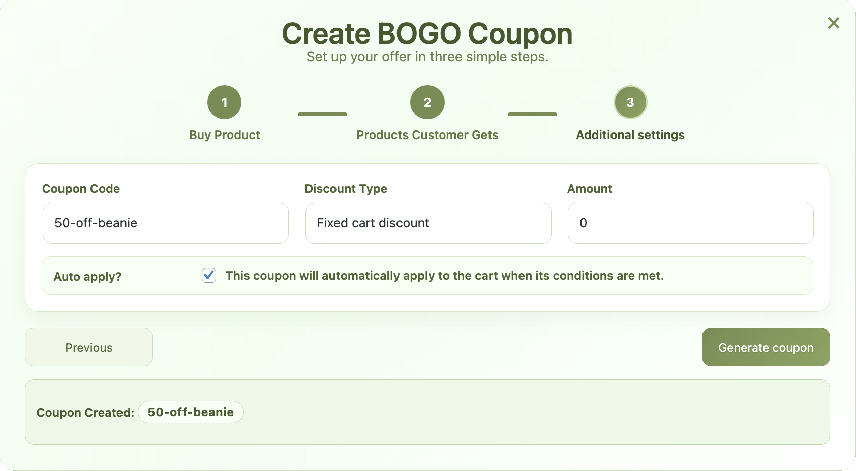 b. Select a discount type and amount. (The discount will be applied to the cart total.) - Click on the Generate coupon button.