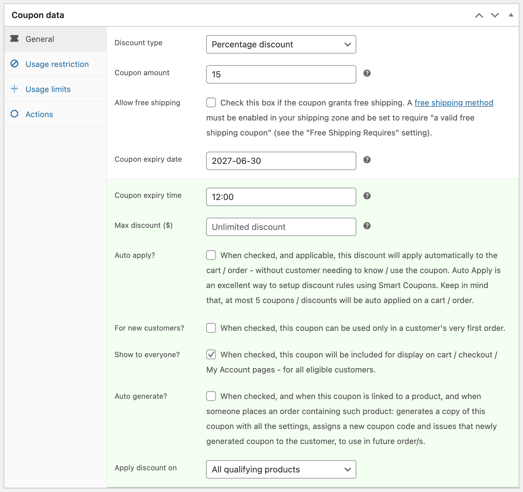 Smart Coupons provide a powerful, “all-in-one” solution for gift cards, store credits, discount coupons, and vouchers extending the core functionality of WooCommerce coupons.