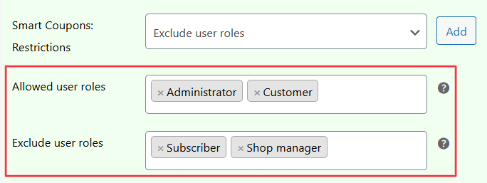 - Again, from the Smart Coupons Restrictions dropdown, select “Exclude user roles” and click on the “Add” button.