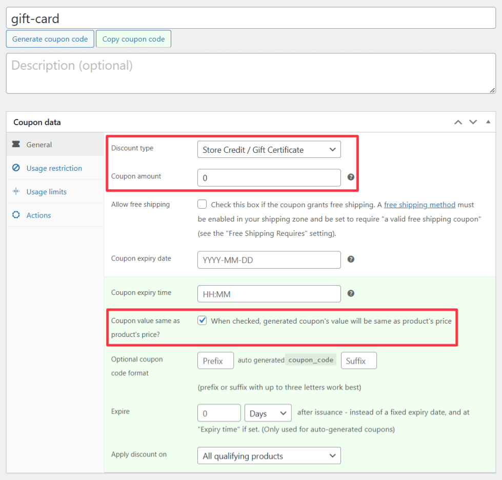 Important: Leave the coupon amount blank. - Select the Coupon value same as product’s price? checkbox option.