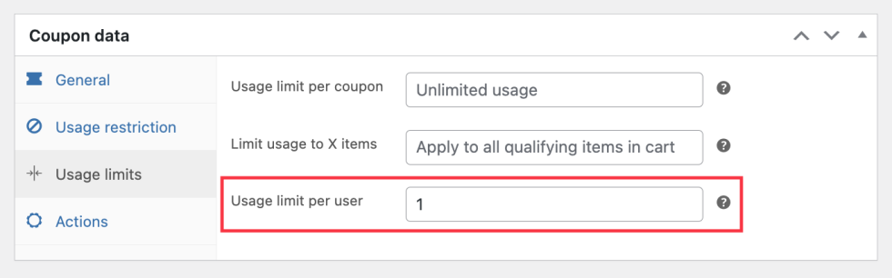 Important: If you have any coupon in your store that can be used to buy the above gift card/store credit, make sure to set Usage limit per user under Usage Limits to 1 for that coupon. Otherwise, your customer will get real credit at a discounted rate multiple times, resulting in a loss for you.