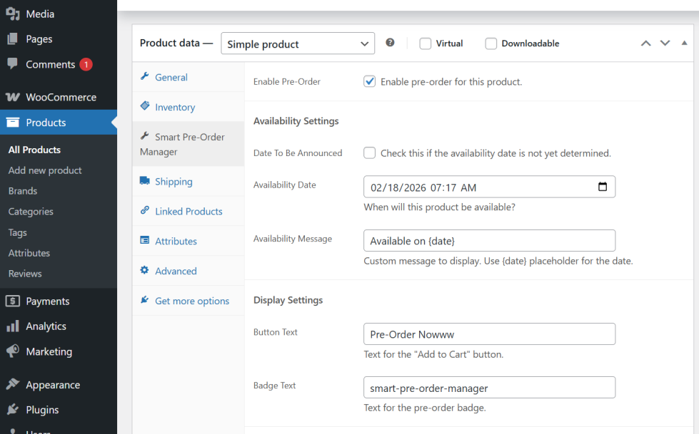 ↑ Back to topInside the WooCommerce Product Edit screen, look for the Smart Pre-Order Manager tab.