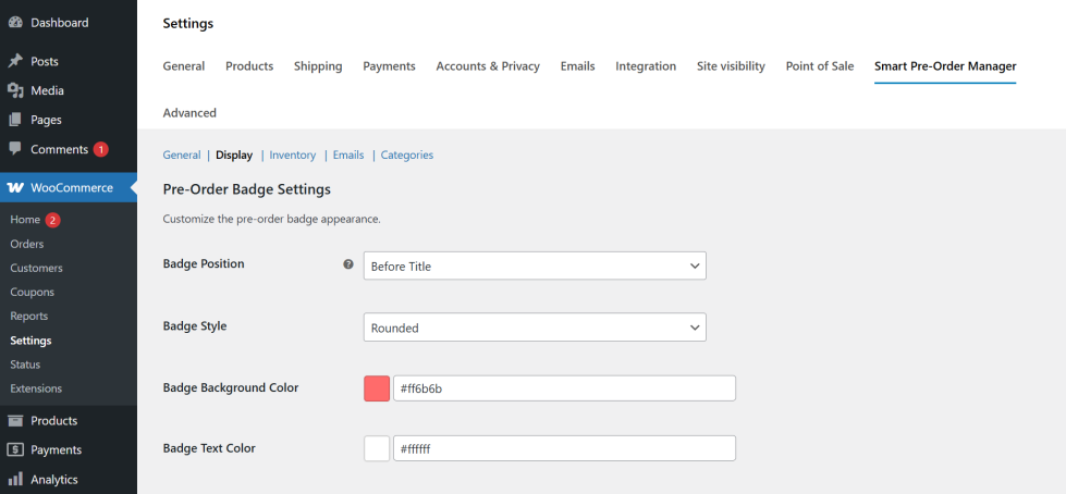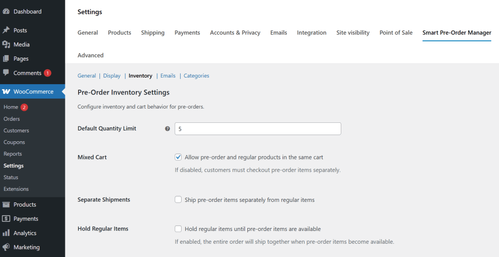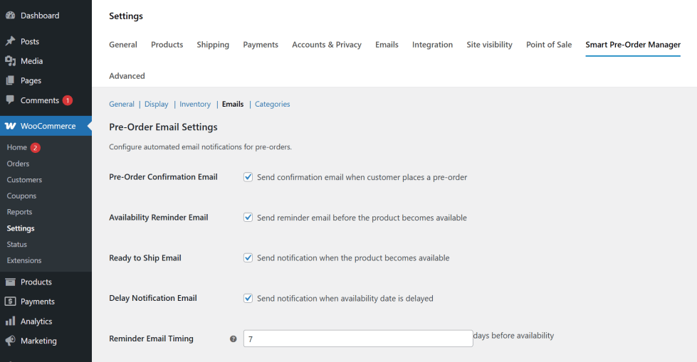 All global configurations, including mixed cart behavior, countdown timer styles, and automatic email settings, are located under the WooCommerce Settings panel. Navigate to the “Smart Pre-Order Manager” tab to manage your entire pre-launch strategy from a single dashboard.