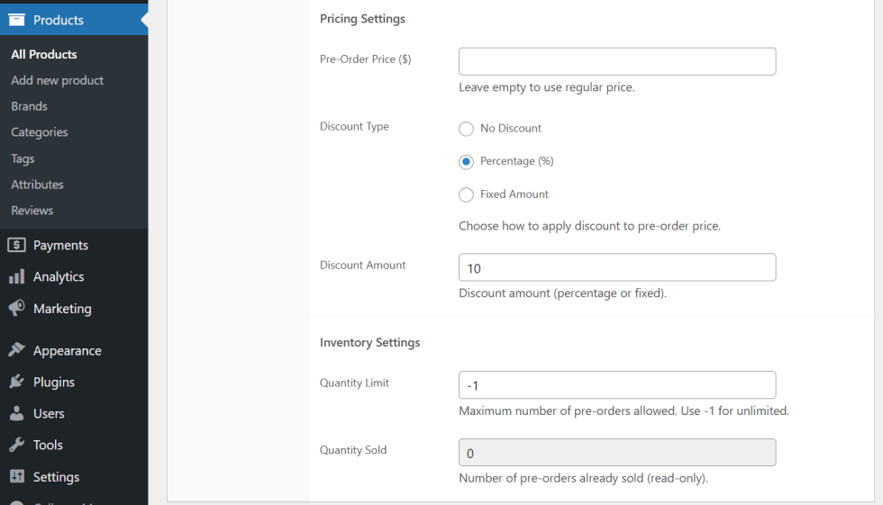 -1for unlimited. - Quantity Sold: A read-only field showing how many pre-orders have been processed by the system.
