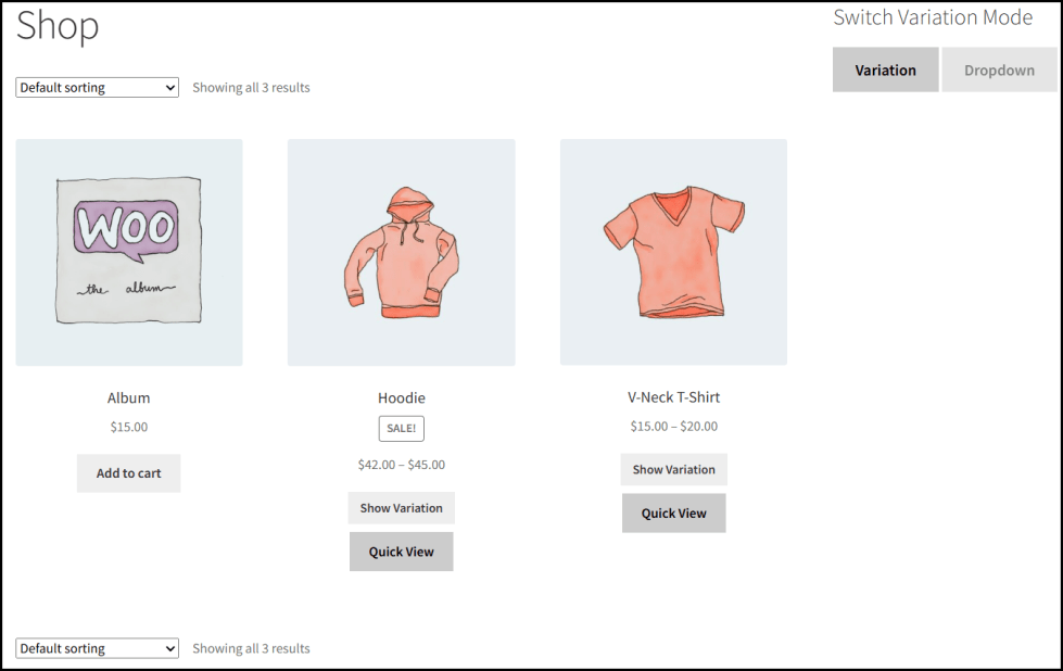 ↑ Back to topAbsolutely. The plugin includes a variation mode switcher widget that lets users toggle between the dropdown and variation view in real time—no reload or settings change needed.