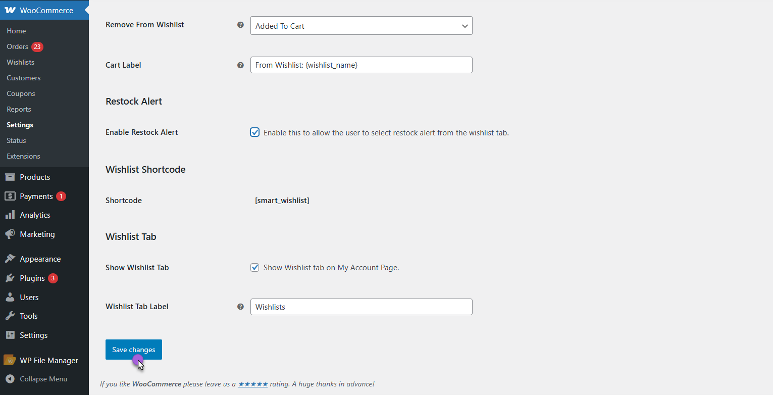 • Navigate to WooCommerce > Settings > Smart Wishlist > Wishlist Page