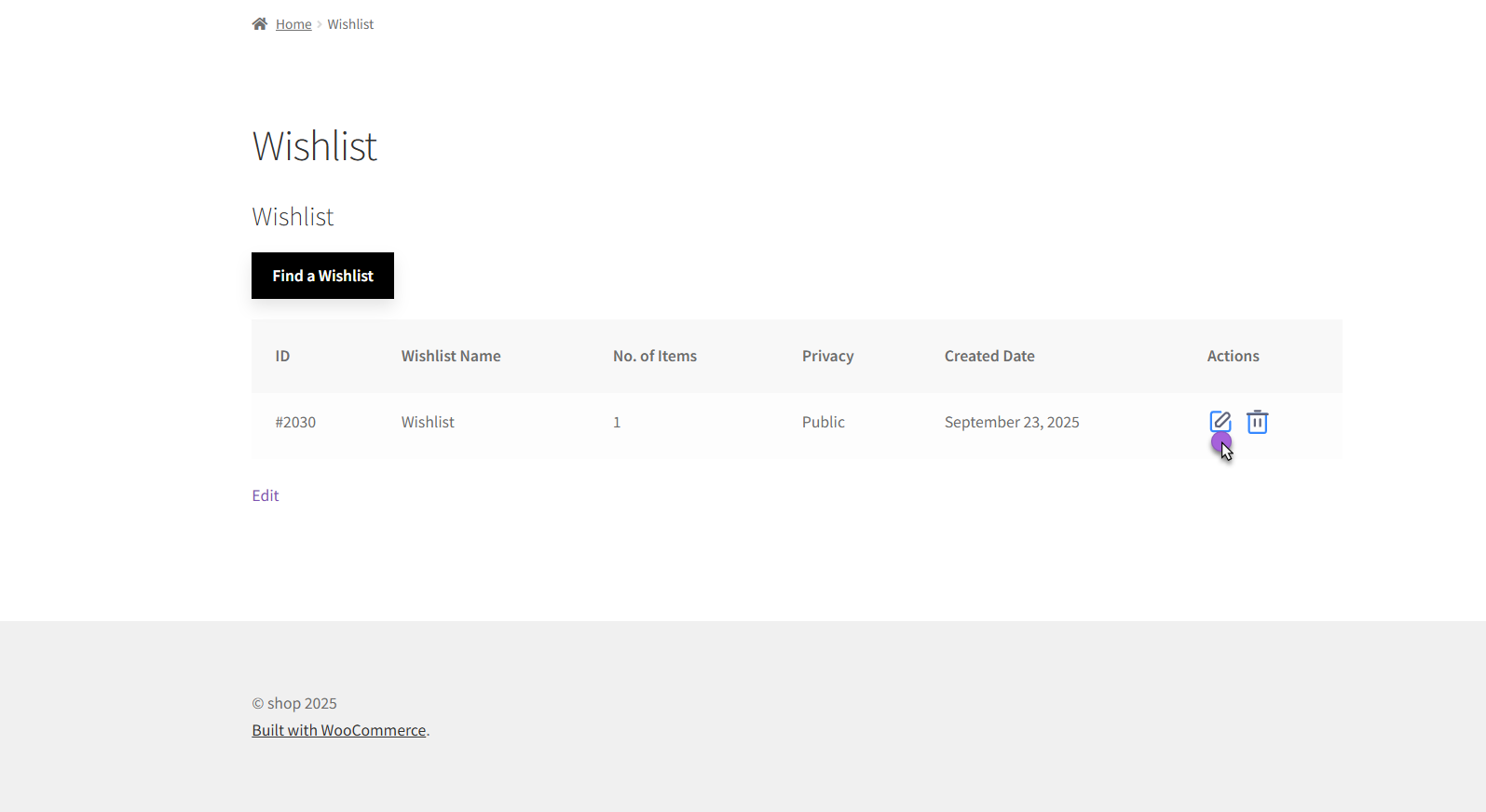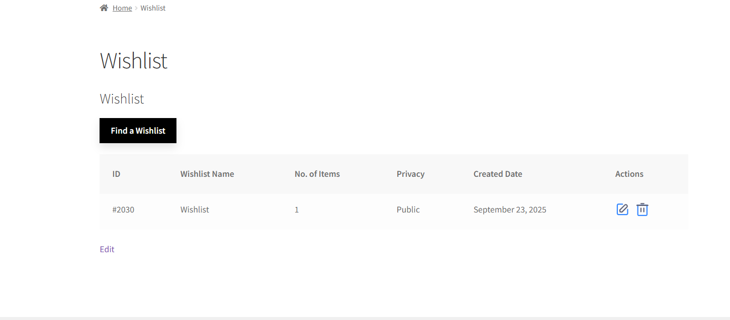 1. The user can view and edit the created Wishlists by clicking on the Edit option in the actions column.