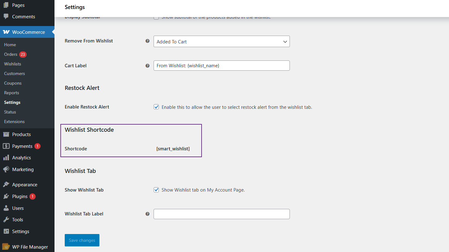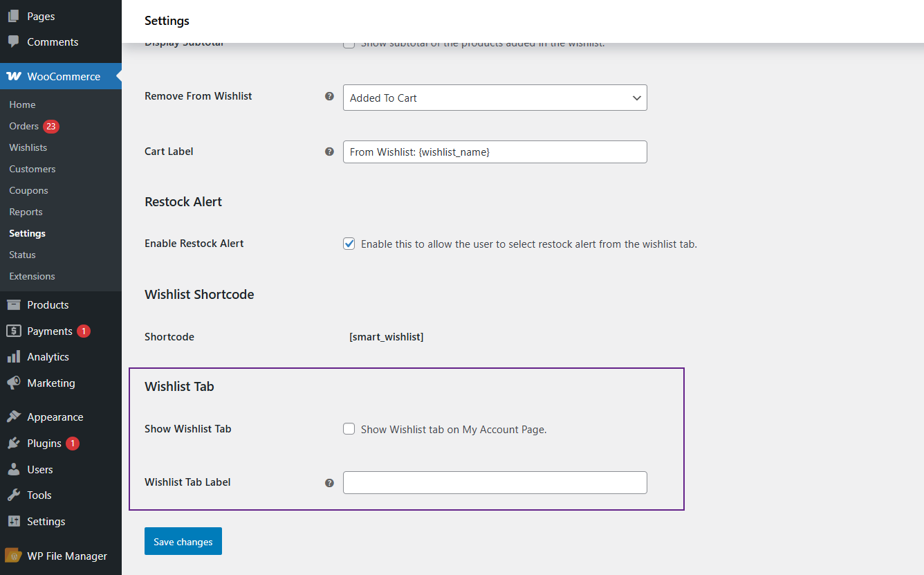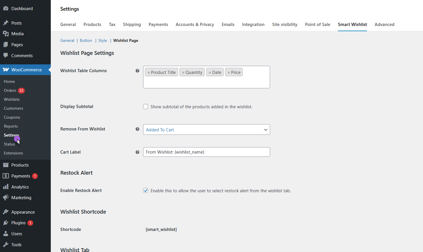 • Navigate to WooCommerce > Settings > Smart Wishlist > Wishlist Page.