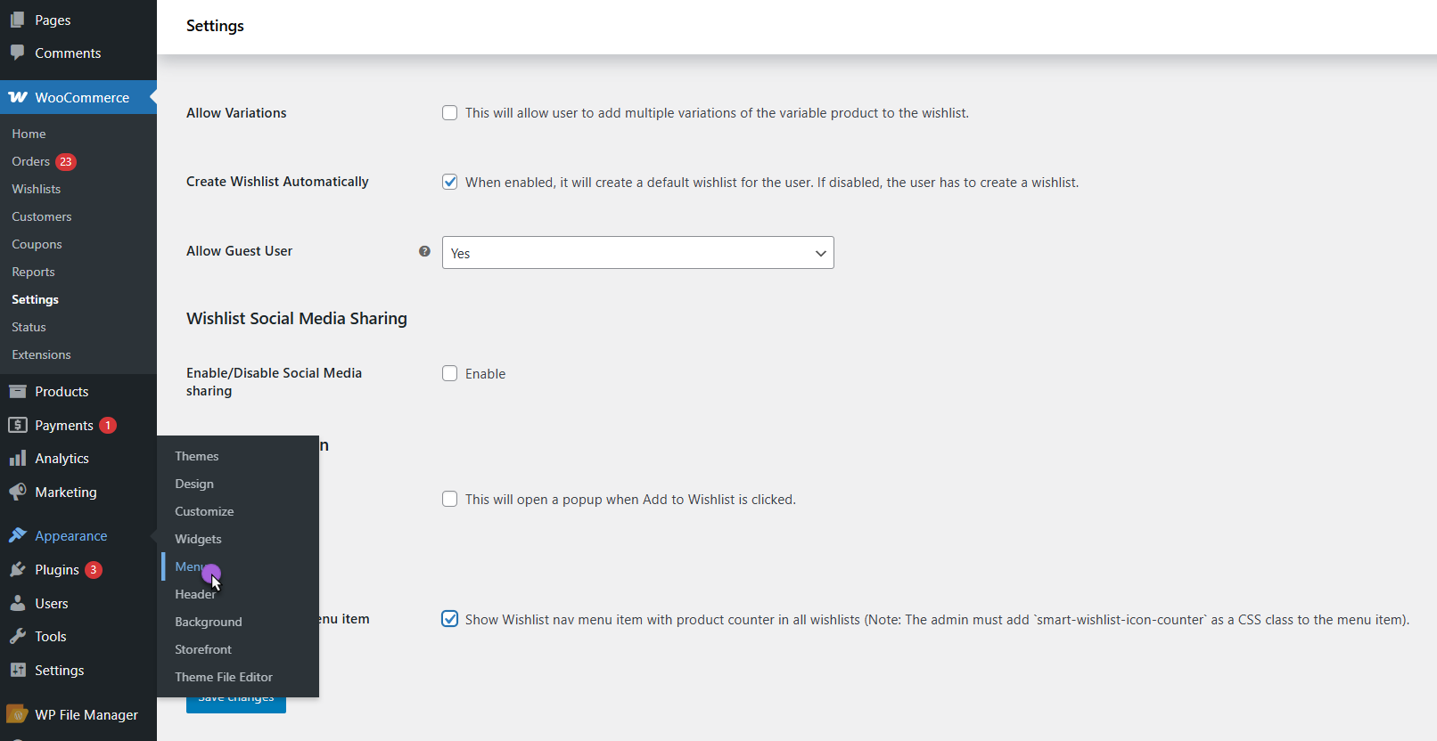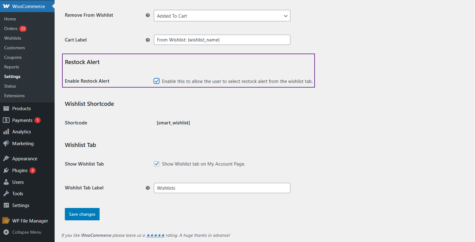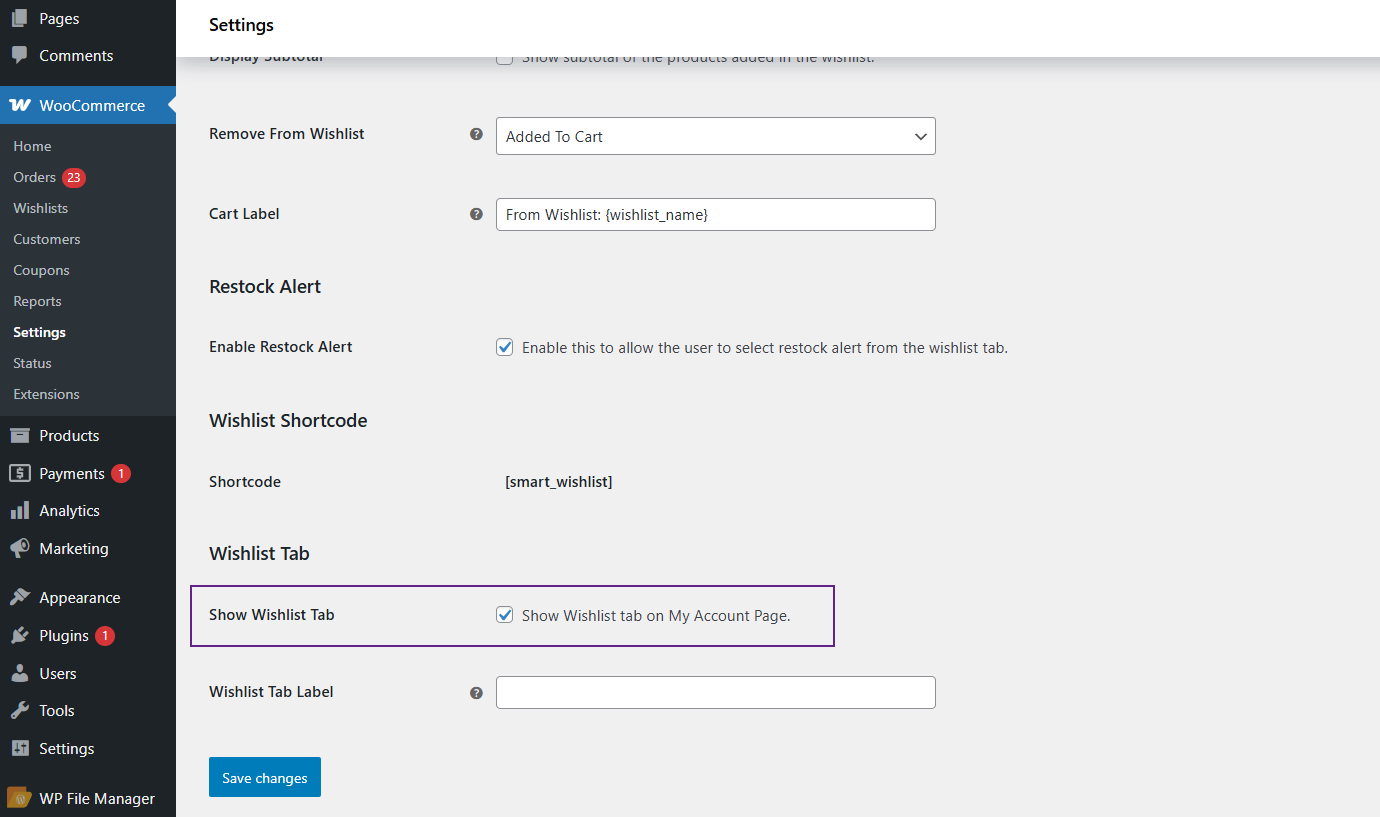• Navigate to WooCommerce > Settings > Smart Wishlist > Wishlist Page.