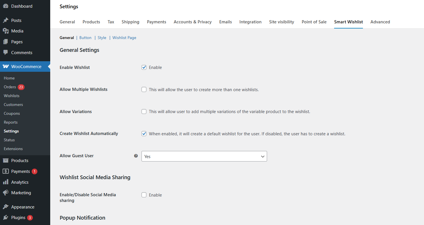For the general settings of the Wishlist, Go to WordPress Admin Dashboard WooCommerce  Settings Smart Wishlist.