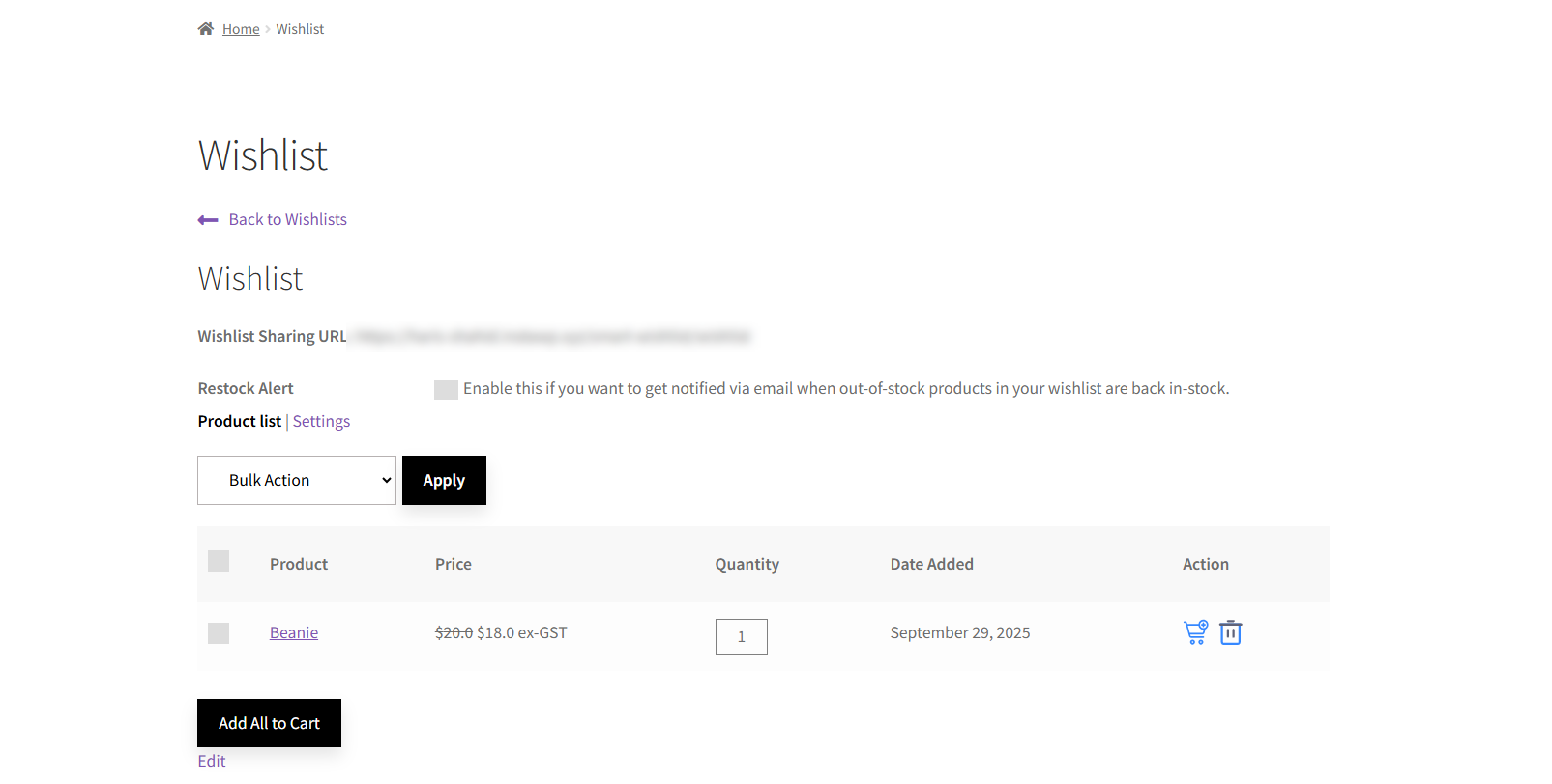 1. The Wishlist will appear with the products added to the wishlist. The user can move the product to the cart by clicking on the icon individually or add all items to the cart by the Add All to cart.