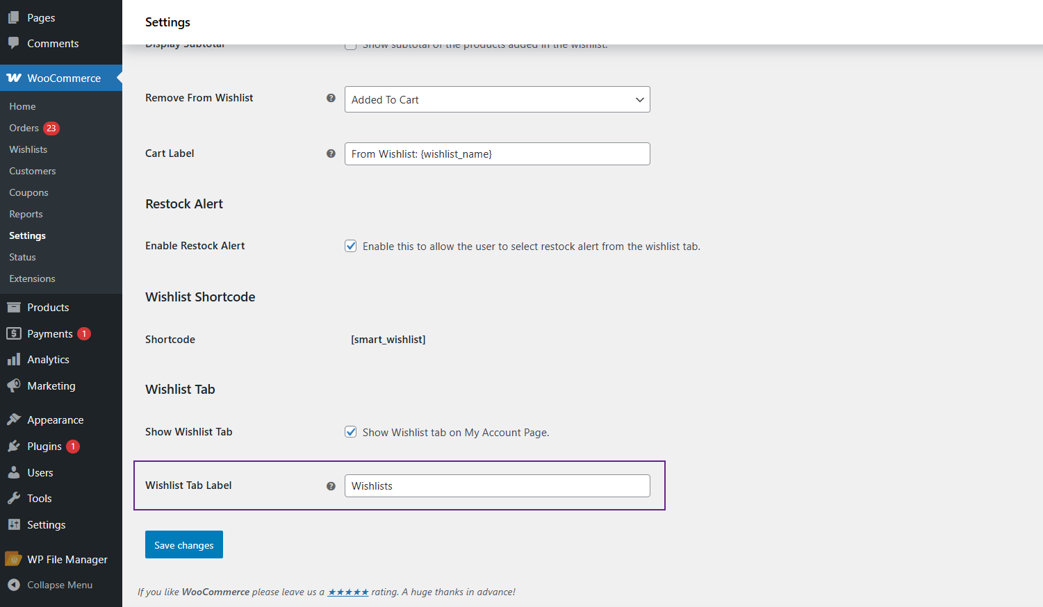 • In this input box, enter the text you want to display as the label of the wishlist tab and section header in My Account.